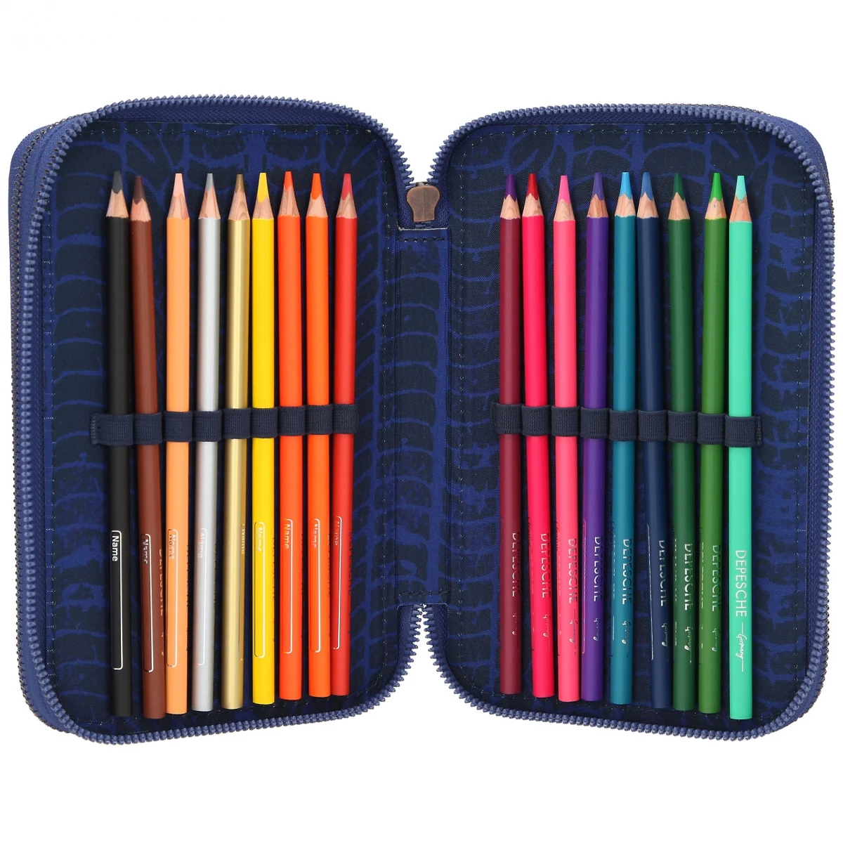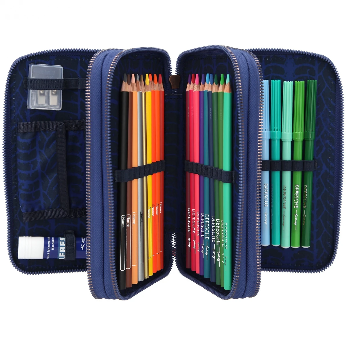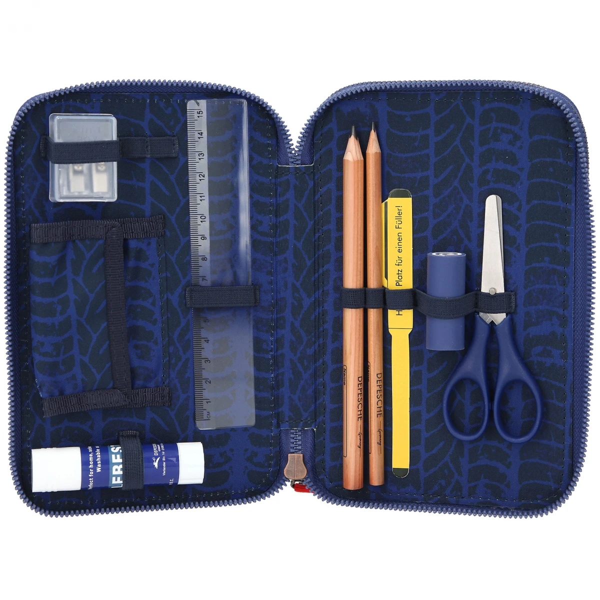 Die drei separaten Reißverschluss-Fächer sind komplett gefüllt mit 18 Buntstiften (Neu: verbesserte Holzqualität und dickere, stabilere Minen), 18 Filzstiften, Schere, Lineal, Anspitzer, Radierer, Klebestift und einer kleinen Klett-Innentasche.