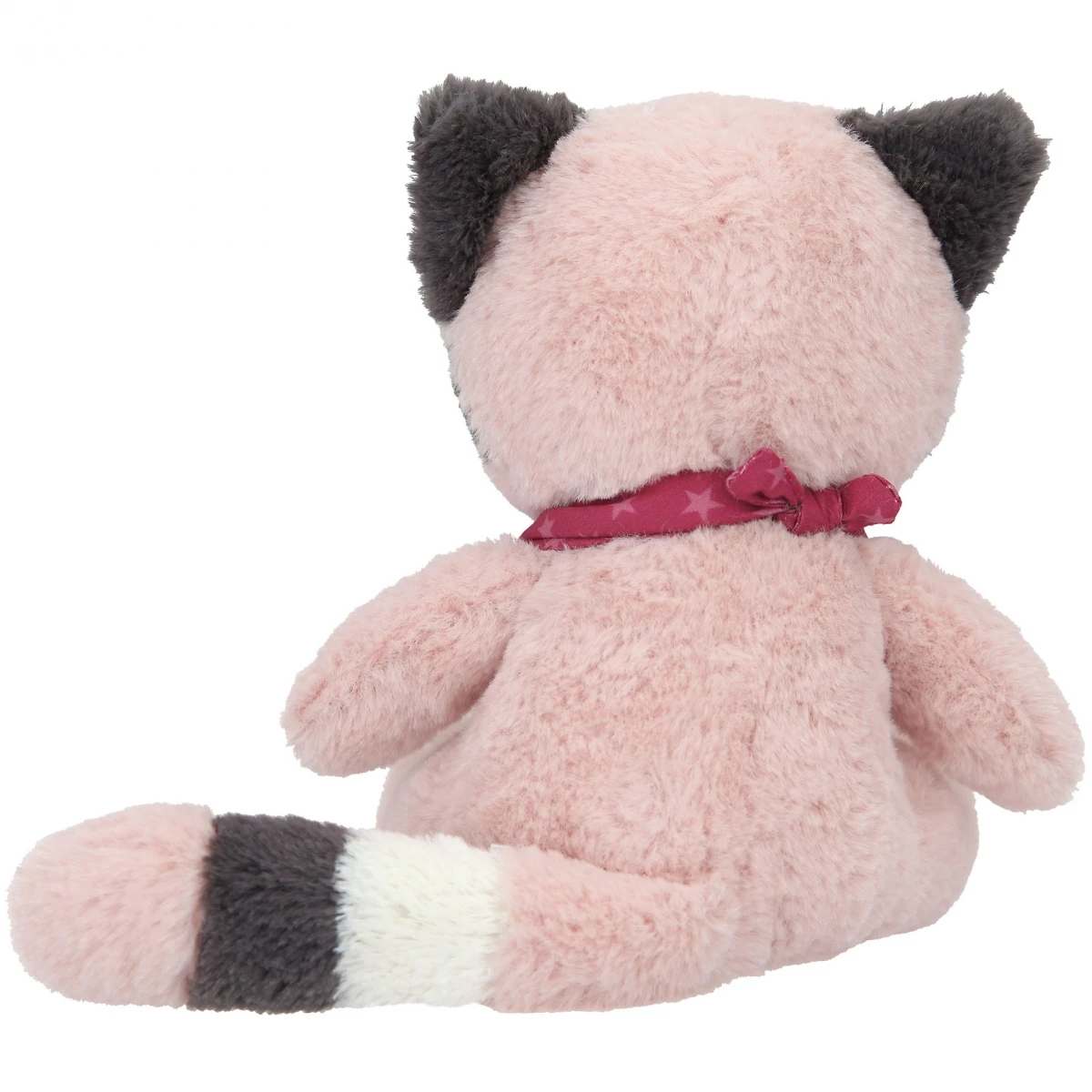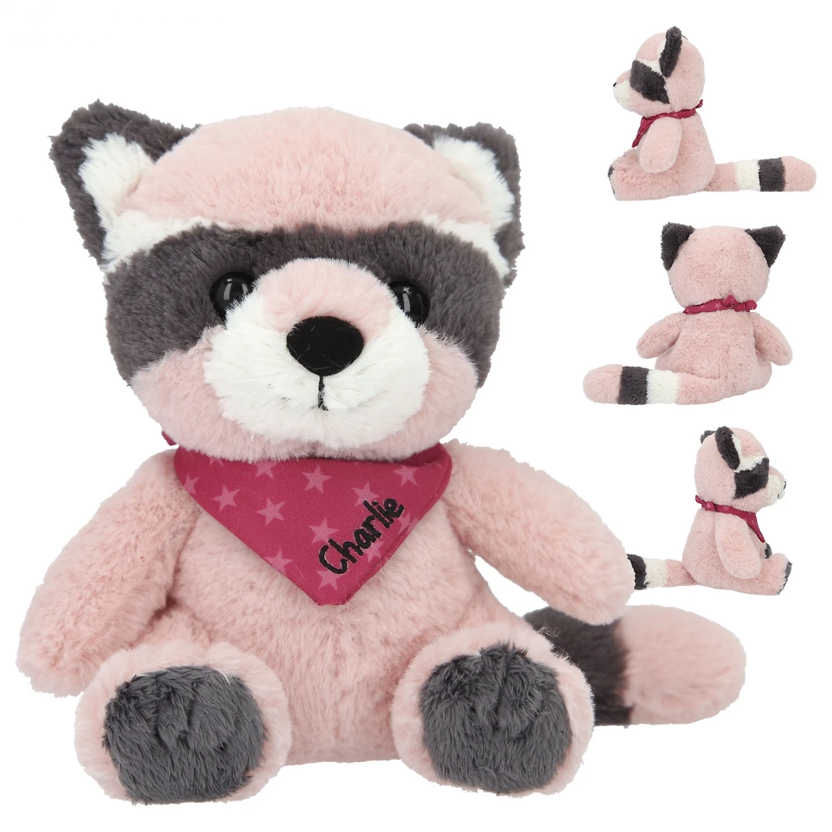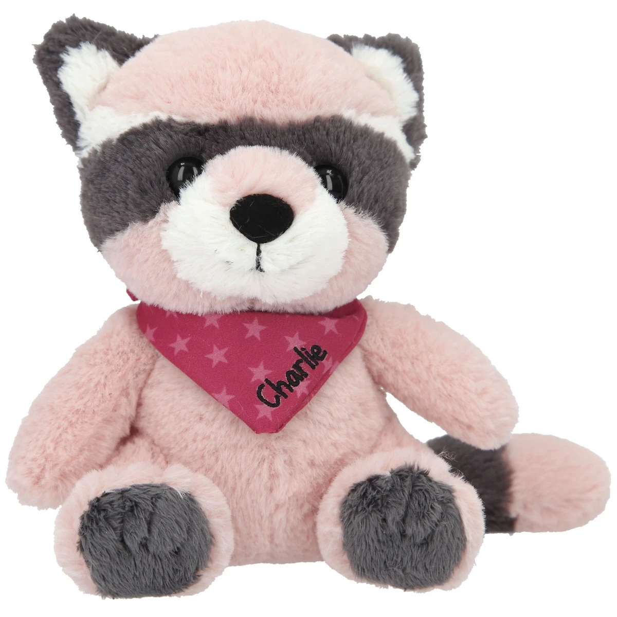 Unglaublich weich und superniedlich: Der Kuschel-Waschbär Charlie hat ein rosé-graues Plüschfell, süße Knopfaugen und ein rosa Halstuch, auf dem sein Name gestickt ist.