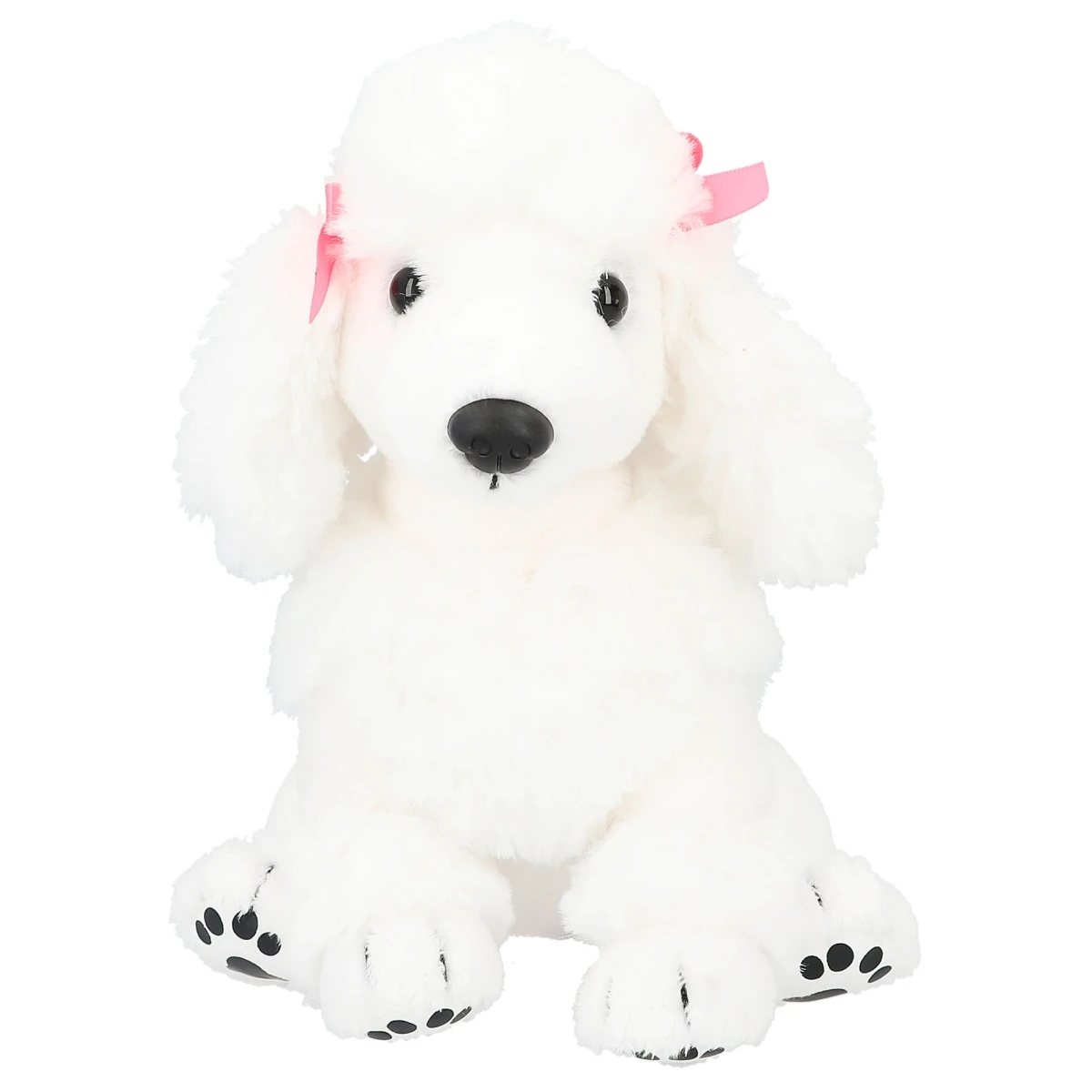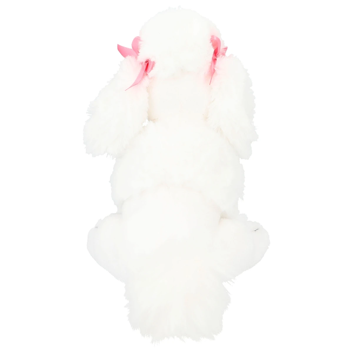 Der weiße Plüsch-Pudel Chanel hat schwarze Knopfaugen und an jedem Ohr ein rosa Schleifchen.