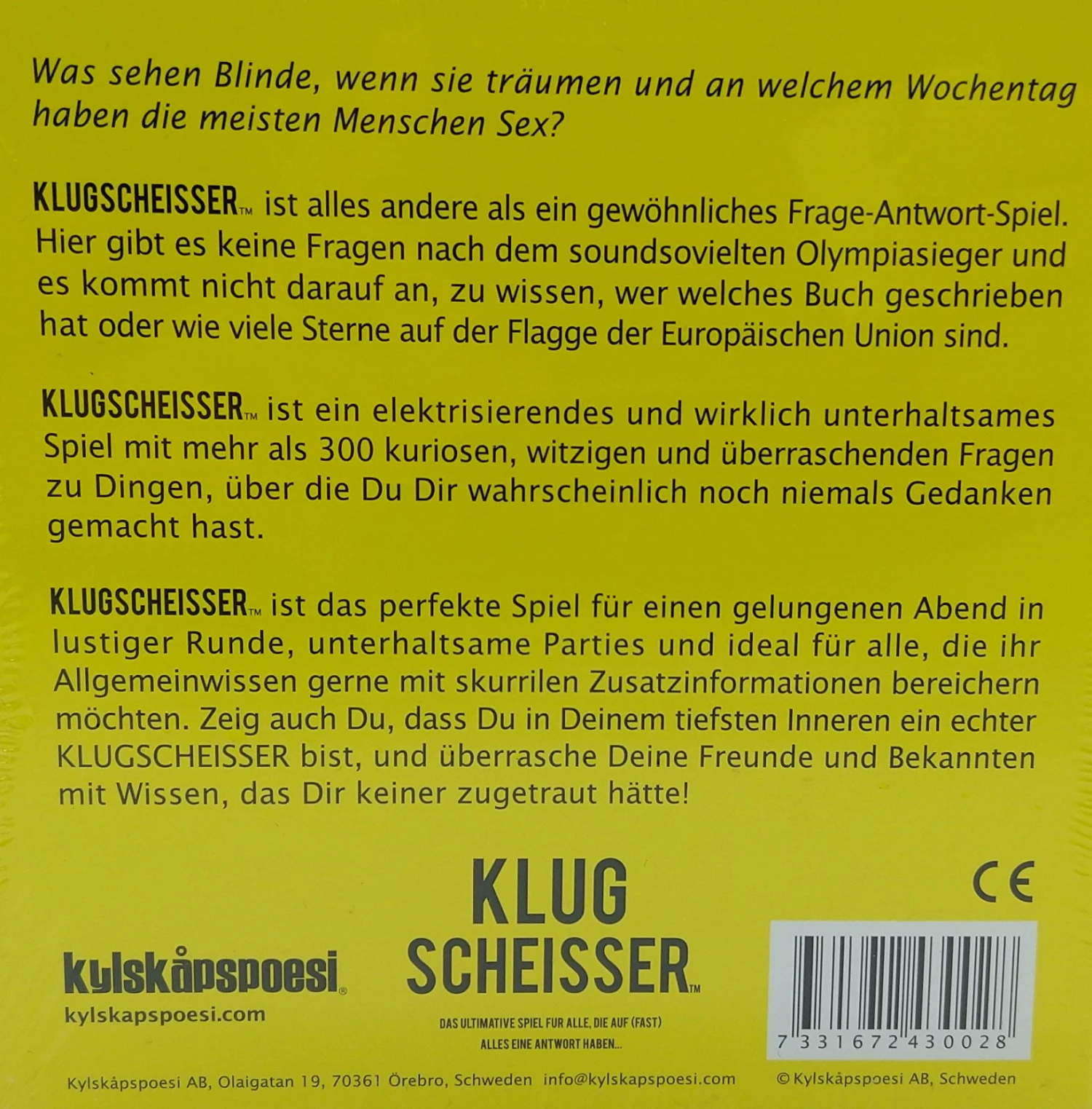 KLUGSCHEISSER ist ein elektrisierendes und wirklich unterhaltsames Spiel mit mehr als 300 kuriosen, witzigen und überraschenden Fragen zu Dingen, über die Du Dir wahrscheinlich noch niemals Gedanken gemacht hast.